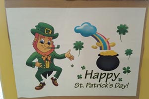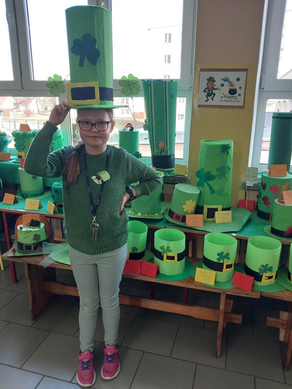 17 marca w naszej szkole ponownie zagościł Dzień Św. Patryka. Jest to święto Irlandii, ale my - miłośnicy języków obcych chętnie przyłączyliśmy się do tego jakże radosnego wydarzenia. Kolor zielony był królem tego dnia. Na korytarzach pojawiły się zielone koniczynki oraz flagi Irlandii - oczywiście z kolorem zielonym na przedzie. Tradycją jest ubieranie się na zielono w tym dniu. My również o tym nie zapomnieliśmy. Klasa Ia oraz I b to najbardziej zakręcone klasy na zielono- 100% uczniów miało tę barwę na sobie.Skrzat irlandzki o imieniu Leprikon przechadzał się po korytarzach podziwiając wszystkie zielone kapelusze, które zostały przygotowane specjalnie na ten czas. A było ich naprawdę niemało, bo ponad 50! Wszystkie kapelusze wzięły udział w konkursie i żaden nie zostanie pominięty. Uczniowie mogli na kilka sekund wcielić się w skrzata o rudej brodzie i pstryknąć sobie pamiątkową fotkę. Wszyscy spisali się na medal, więc otrzymali słodką nagrodę w postaci cukierków od Leprikona. Ogólnie skrzaty słyną z chytrości, więc ten zielony chyba nas lubi.