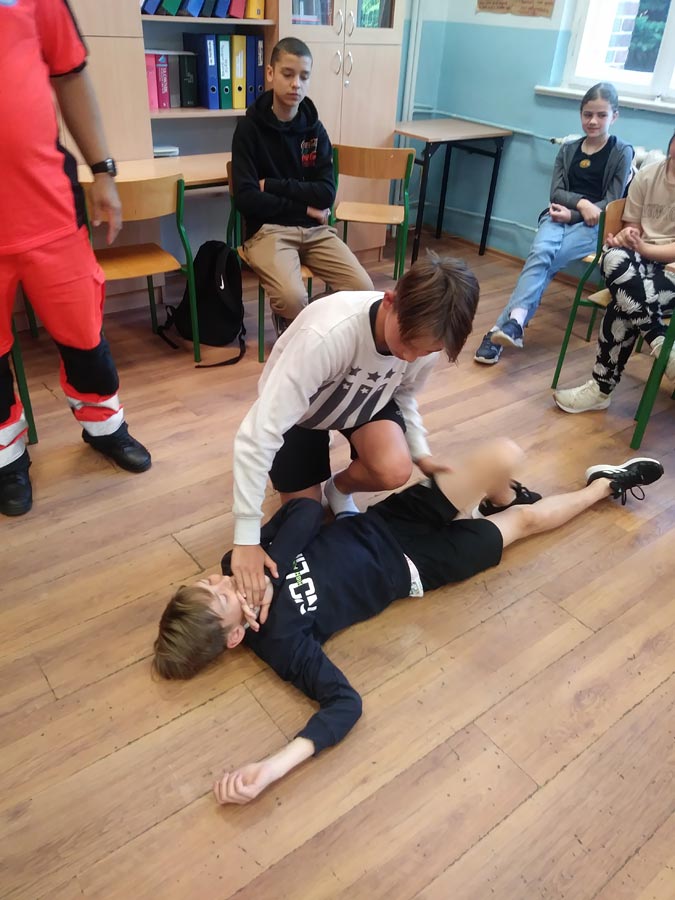 Ratownik medyczny, pan Mariusz Szymański przeprowadził ćwiczenia z pierwszej pomocy przedmedycznej. Uczniowie przypomnieli numery alarmowe, ćwiczyli na fantomie.