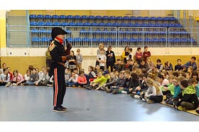 I tak podróż w czasie rozpoczęła się od średniowiecza, a skończyła w czasach współczesnych. Mistrz Jacenty w przystępny sposób przedstawił postać sławnego rycerza, bohatera bitwy pod Grunwaldem, Zawiszy Czarnego, następnie hetmana Stefana Czarnieckiego, Piotra Wysockiego, bohatera powstania listopadowego. Na koniec uczniowie poznali ciekawostki z życia Józefa Piłsudskiego. Prezentację każdej postaci kończył pokaz zbroi i mundurów. Uczniowie poznali uzbrojenie rycerza, husarii polskiej, umundurowanie i broń IV Pułku Grenadierów - słynnych Czwartaków, a także mundur i broń z czasów Józefa Piłsudskiego. Za każdym razem, po prezentacji postaci, chętni uczniowie przywdziewali zbroję i mundury, prezentowali broń, a także, ku uciesze zebranych, poddawali się ćwiczeniom sprawnościowym z bronią. Musztra prowadzona przez pana Jacka wywoływała salwę śmiechu, gdyż zadania nie były łatwe.