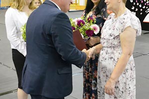 Natomiast w budynku szkoły przy ulicy Chrobrego 5a p. Dyrektor Edward Szmul serdecznie powitał zebranych w hali sportowej szkoły uczniów, rodziców, nauczycieli oraz gości - Burmistrza Miasta Reszel, p. Marka Janiszewskiego, zastępcę przewodniczącej Rady Rodziców, p. Annę Pawelec oraz proboszcza miejscowej parafii, ks. Piotra Piaseckiego. W szczególny sposób powitał również Panie – Małgorzatę Krajewską oraz Annę Lemechę, które zdecydowały po wielu latach pracy w naszej szkole, przejść na emeryturę.